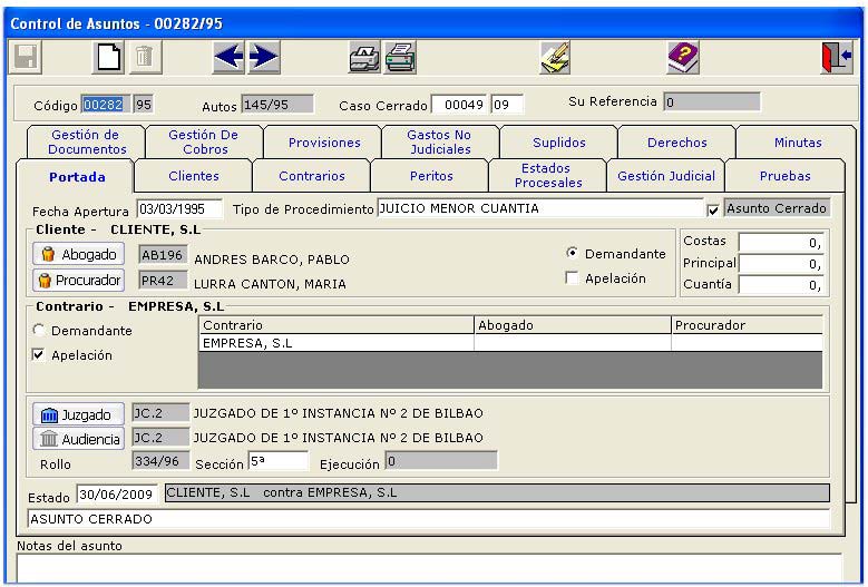 - Mantenimiento de fichas de Abogados, Procuradores, Juzgados, Clientes, Contrarios, Peritos, Poderes notariales, otras partes.