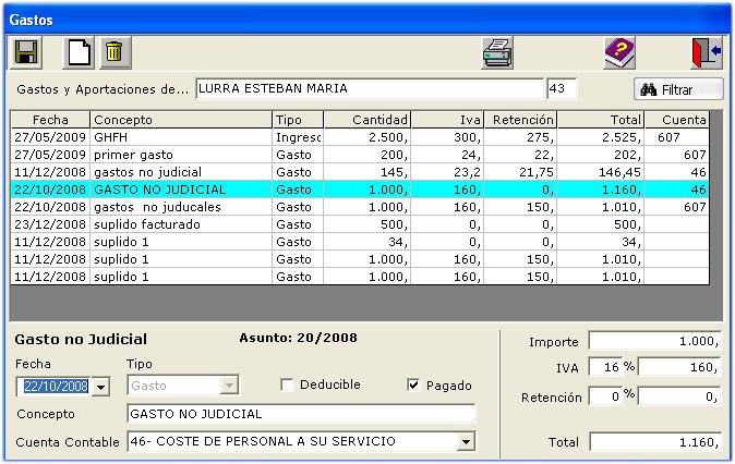 - Contabilidad general del despacho, en el que aparecen los gastos generados a un expediente en concreto y las aportaciones.