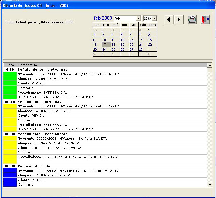- Dietario sobre los vencimientos señalamientos y caducidad diario con emisión de hoja para llevar al juzgado la información básica.
