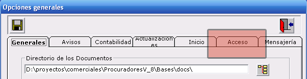Una vez instalado. Ejecutar "Gestión jurídica", entraremos en el programa. Iremos a opciones y se desplegará una ventana con las opciones de configuración de programa. Haremos click sobre la pestaña "Acceso"
